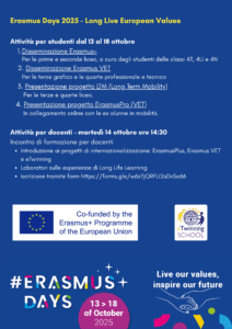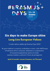 Anche quest’anno la nostra scuola celebra gli Erasmus Days, una settimana dedicata alla valorizzazione dei progetti europei e delle esperienze di mobilità studentesca e docente. Il tema del 2025 è “Long Live European Values”.
